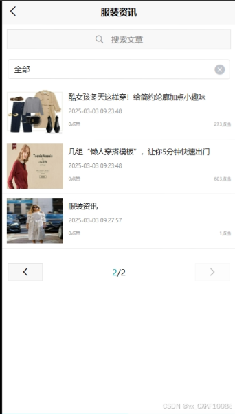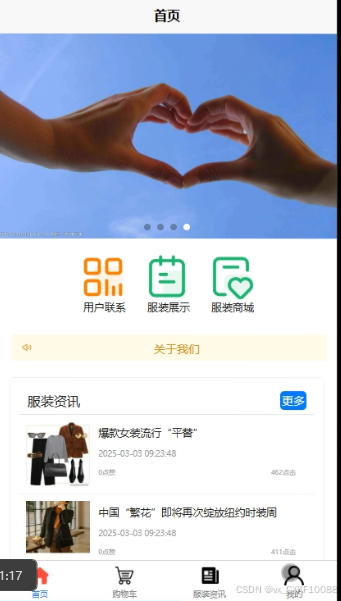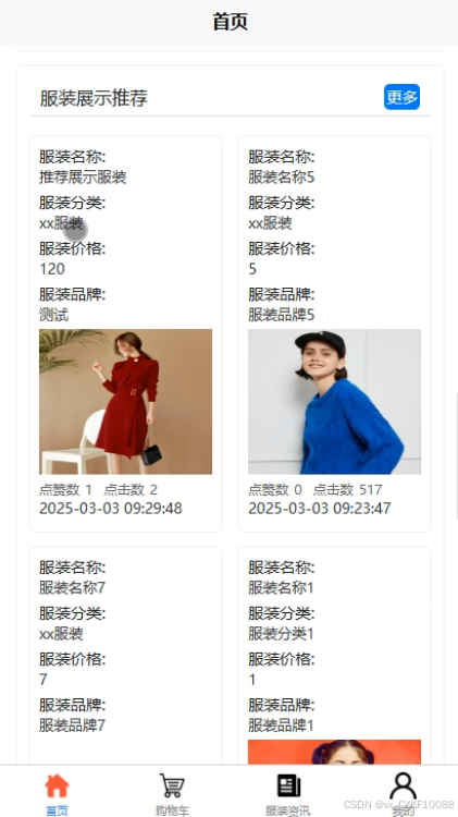 首页:展示系统的核心信息,包括热门推荐、服装资讯、服装展示等。用户可以在首页浏览和搜索服装展示。