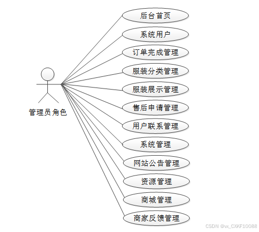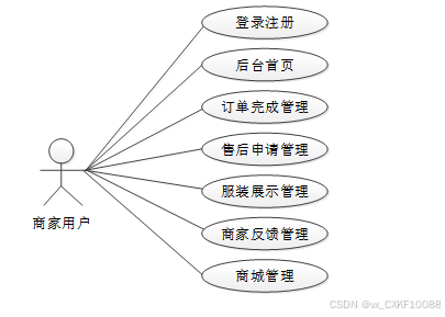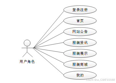 系统的用例展示的是系统功能与用户之间的关系,通过用例的方式能够直观的展示出来,本基于微信小程序的服装推荐系统的完整UML用例图如下所示。