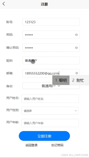 下表是注册功能测试用例,检测了各种数据的输入情况,观察系统的响应情况。得出该功能达到了设计目标。