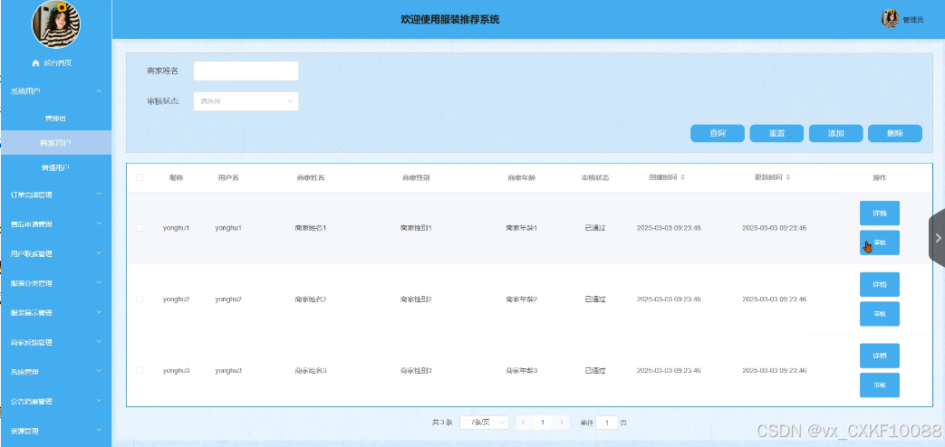 服装展示管理:商家用户可以查看和管理服装展示列表,也可以添加新的服装信息。