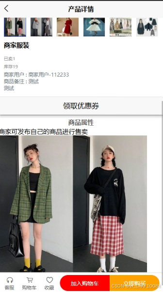 服装商城:提供服装展示列表,用户可以领取优惠券后加入购物车或立即购买。