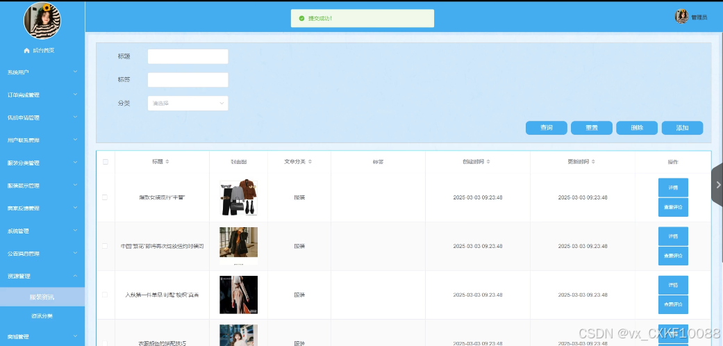 资源管理:管理员可以管理系统的各种资源,如服装资讯、资讯分类等。可以对资源进行添加、删除、修改等操作,以满足系统的日常维护和管理需求。