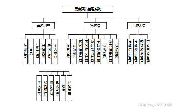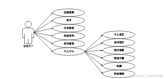 - 个人中心:包括个人首页、房间预订、预定取消、预定更改申请、收藏的房间及评论管理等功能。用户可以查看和管理个人信息、预定记录及收藏的房间信息。