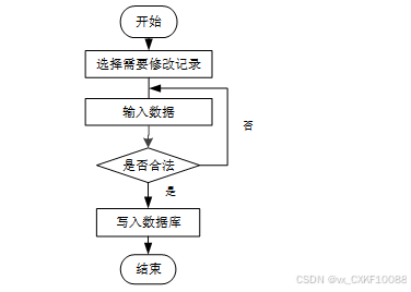用户首先选择需要修改的记录,输入修改后的数据,系统判断输入数据是否合法。若数据不合法,提示重新输入;若数据合法,则将修改后的数据写入数据库,完成操作后流程结束。修改信息流程图如图3-7所示。