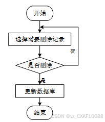 用户选择需要删除的记录后,系统判断是否确认删除。若未确认,返回选择环节;若确认删除,则更新数据库,删除对应记录,完成操作后流程结束。删除信息流程图如图3-8所示。