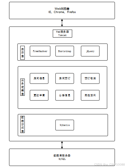 系统由表现层、业务逻辑层、数据访问层和数据库服务器组成。表现层通过浏览器(如IE、Chrome、Firefox)与用户交互,采用FreeMarker、Bootstrap、jQuery等技术实现界面呈现。业务逻辑层负责处理系统的核心业务逻辑,通过分模块设计实现功能分离。数据访问层使用MyBatis框架连接数据库,执行数据的增删改查操作。数据库服务器采用MySQL进行数据存储和管理,为系统提供稳定的数据库支持。整个架构通过Tomcat服务器完成用户请求的接收和处理,确保系统的高效运行[8]。整个系统架构如图4-1所示。