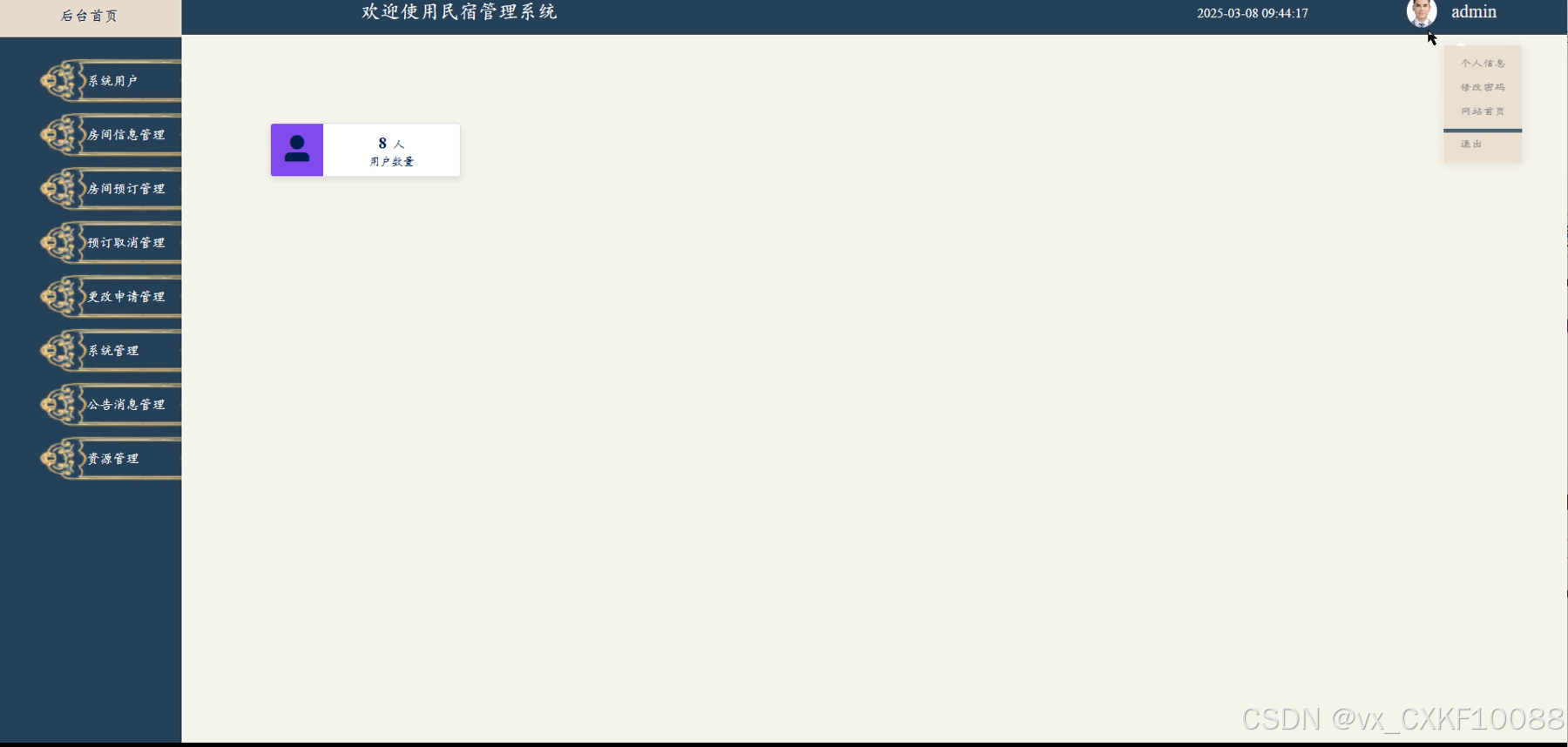- 房间预定管理:管理员能够查看用户的房间预定情况,并根据需要进行调整。