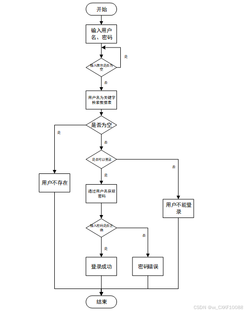 用户输入用户名和密码后,系统先检查输入是否为空,再验证用户名是否存在,若存在则通过用户名获取密码并校验。若密码正确则登录成功,否则提示密码错误。若用户名不存在或无法登录,提示用户操作无效。如图3-4所示。