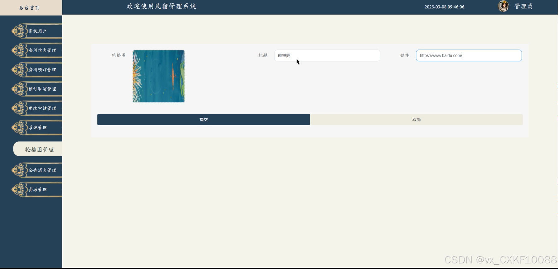 管理员的系统管理界面中的轮播图管理功能,通常用于管理网站或系统首页展示的轮播图(即图片幻灯片)。管理员可以通过该功能上传、删除或更新首页轮播图的内容,确保展示的图片与系统的最新动态或促销信息相符。界面如下图所示。