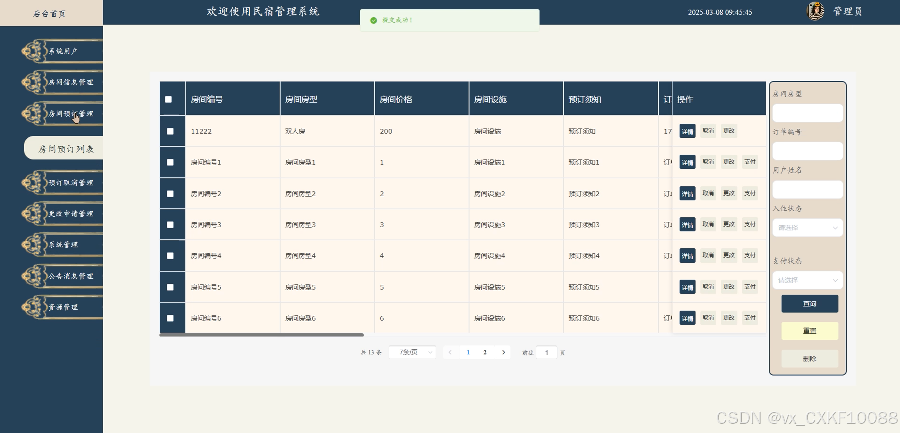房间预定管理界面显示了房间预定列表,包含房间编号、房型、价格、房间设施和预定须知等信息。每一条预定记录旁边都有操作按钮,管理员可以选择查看详细信息、取消预定、更新信息或进行支付操作。右侧的查询栏可以通过订单编号、用户姓名、入住状态及支付状态等信息进行筛选查询,帮助管理员更有效地管理预定信息。界面如下图所示。