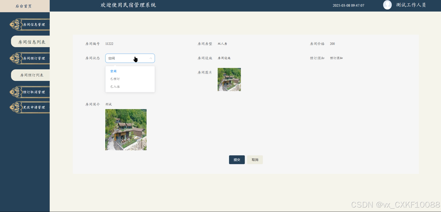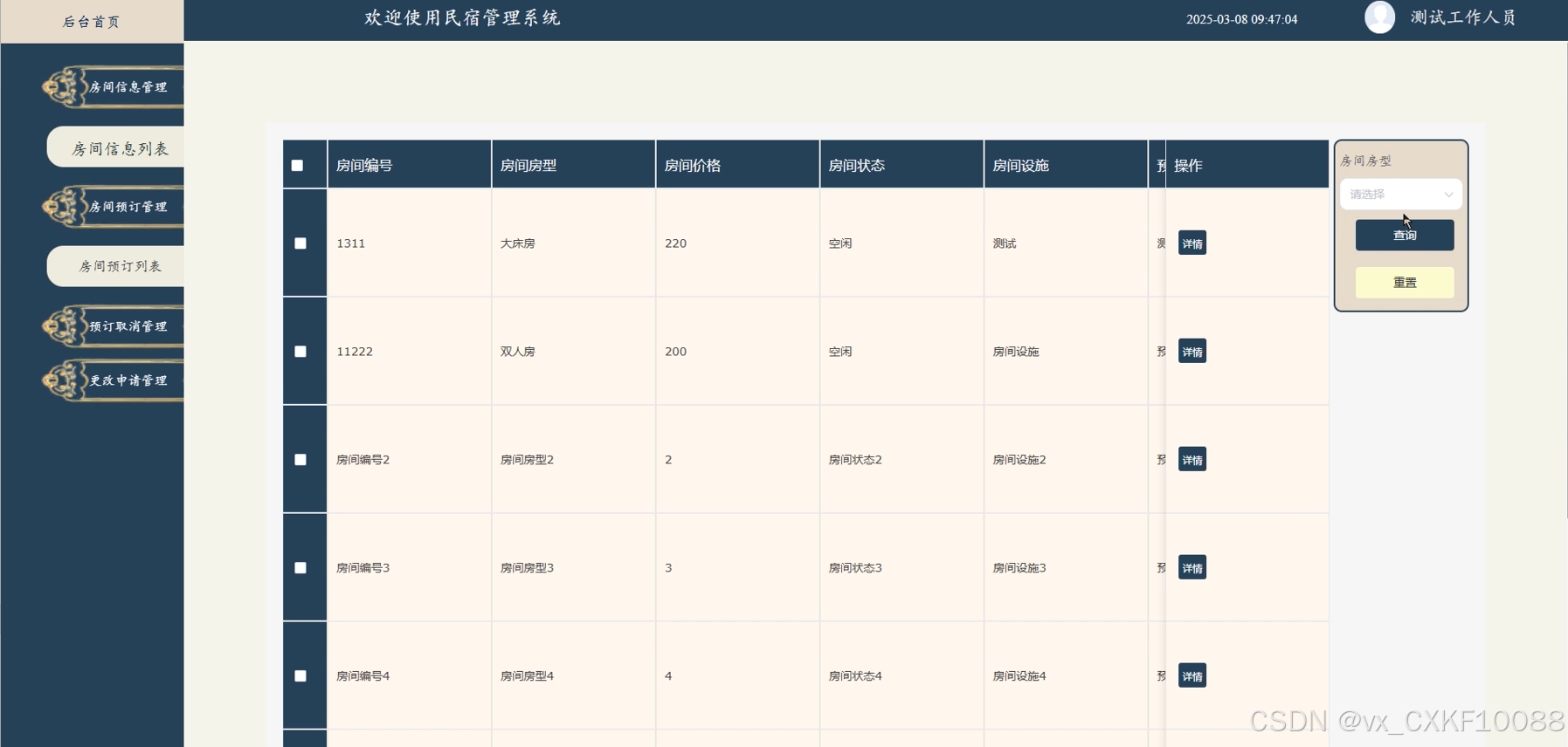 - 房间信息管理:工作人员可以查看和修改房间的状态,确保房间信息的准确性。