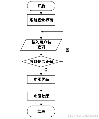 用户首先进入系统登录界面,输入用户名和密码后,系统验证信息是否正确。若验证失败,返回登录界面重新输入;若验证成功,则进入功能界面,执行相应功能处理后结束操作流程。操作流程如图3-5所示。