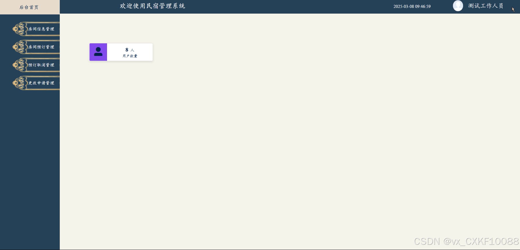 - 房间预定管理:工作人员能够查看和管理房间的预定情况,包括确认、调整和取消预定等。