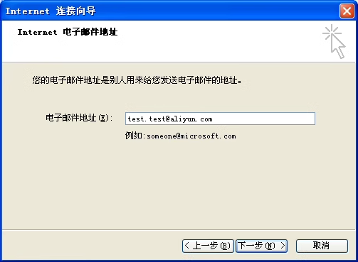 进入 “Internet 电子邮件地址” 页面,在 “电子邮件地址” 输入框中,准确填写你的阿里云邮箱完整地址(格式为 用户名@aliyun.com),例如 test01@aliyun.com(如图 4 所示,输入框下方有格式示例,便于对照)。填写后点击【下一步】。