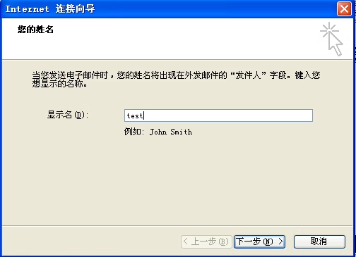 在 “Internet 连接向导” 的第一个页面(标题为 “您的姓名”),输入你希望收件人看到的发件人名称,输入完成后点击【下一步】(如图 3 所示,红框标注输入框位置,底部有 “下一步” 按钮提示)。