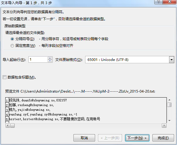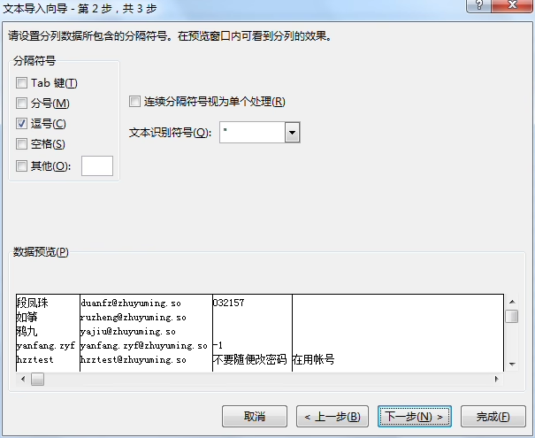 - 此时在 “数据预览” 区域可以看到数据已按逗号分成多列(如姓名一列、邮箱一列),确认无误后点击【下一步】。