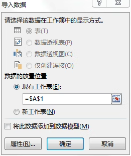 - 选择数据在 Excel 中的存放位置,默认【现有工作表】的 “$A$1”(从 A1 单元格开始存放)即可;