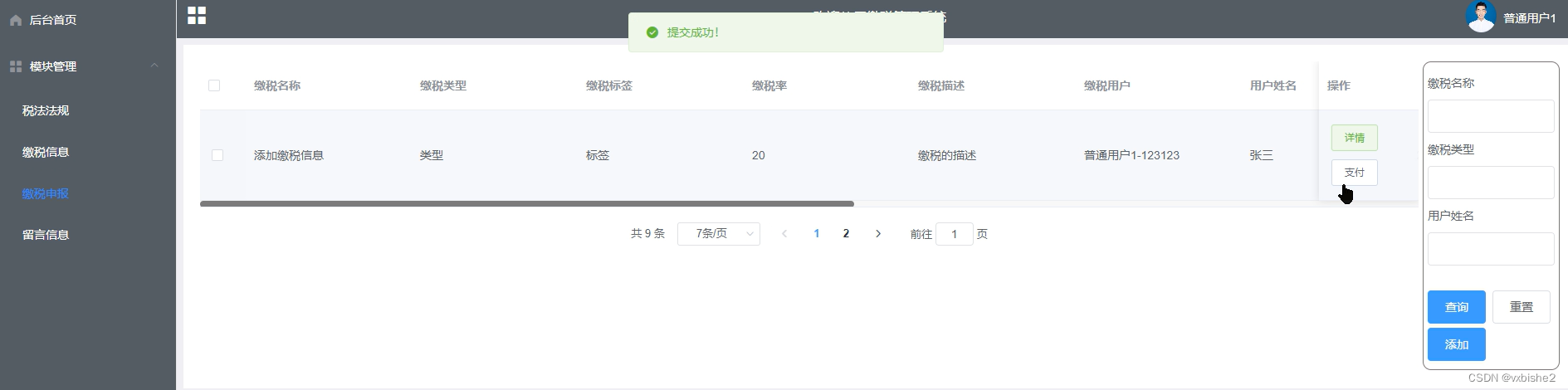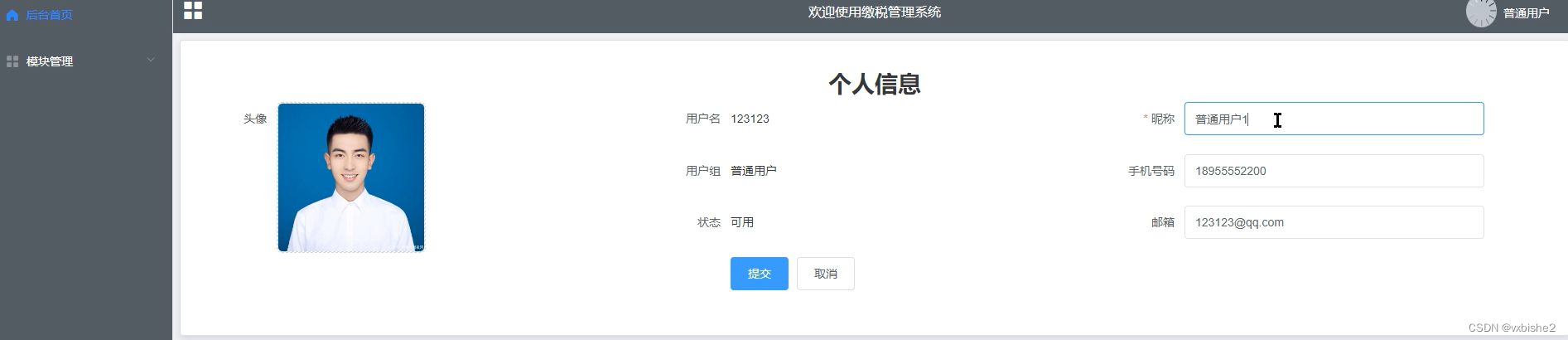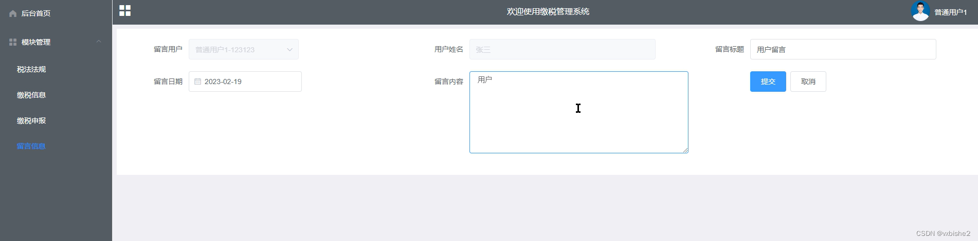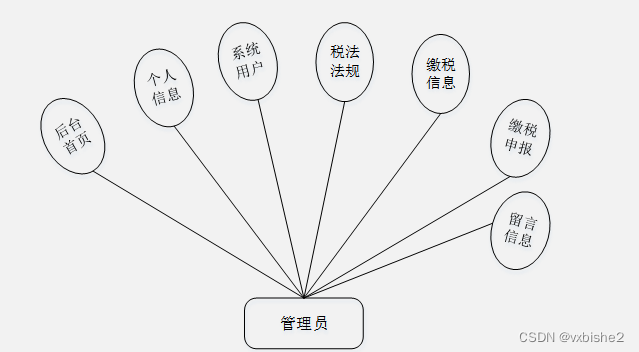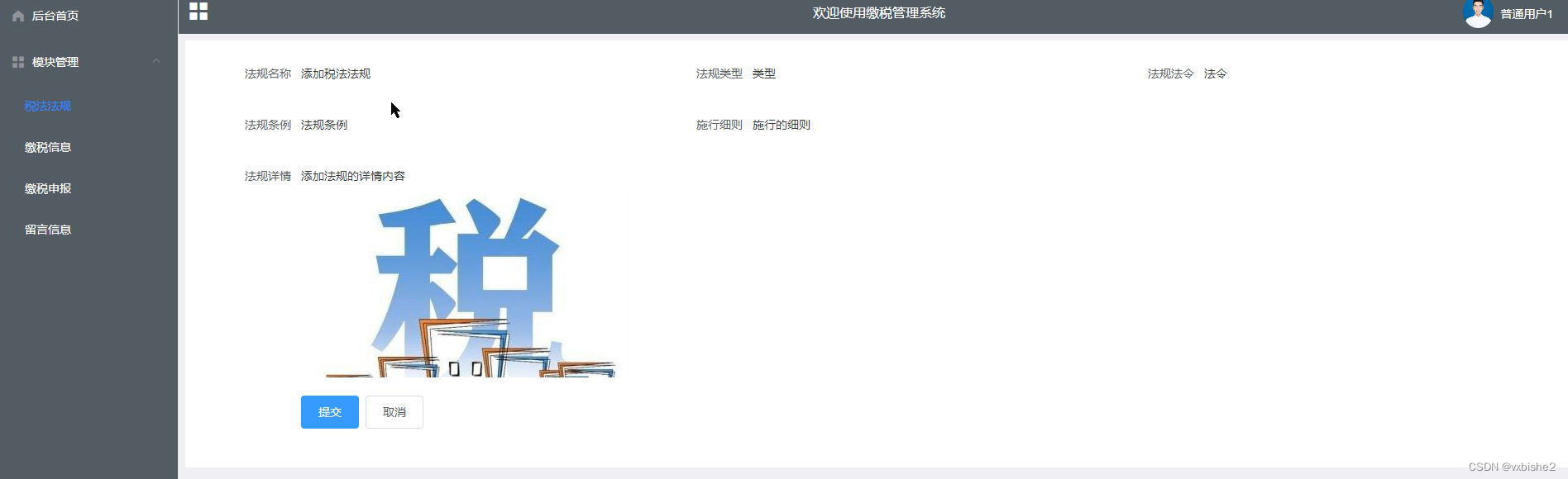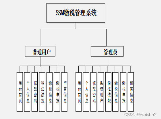 (1)功能要求:可以管理后台首页、个人信息、修改密码、系统用户(管理员、普通用户)、模块管理(税法法规、缴税信息、缴税申报、留言信息)等功能模块。