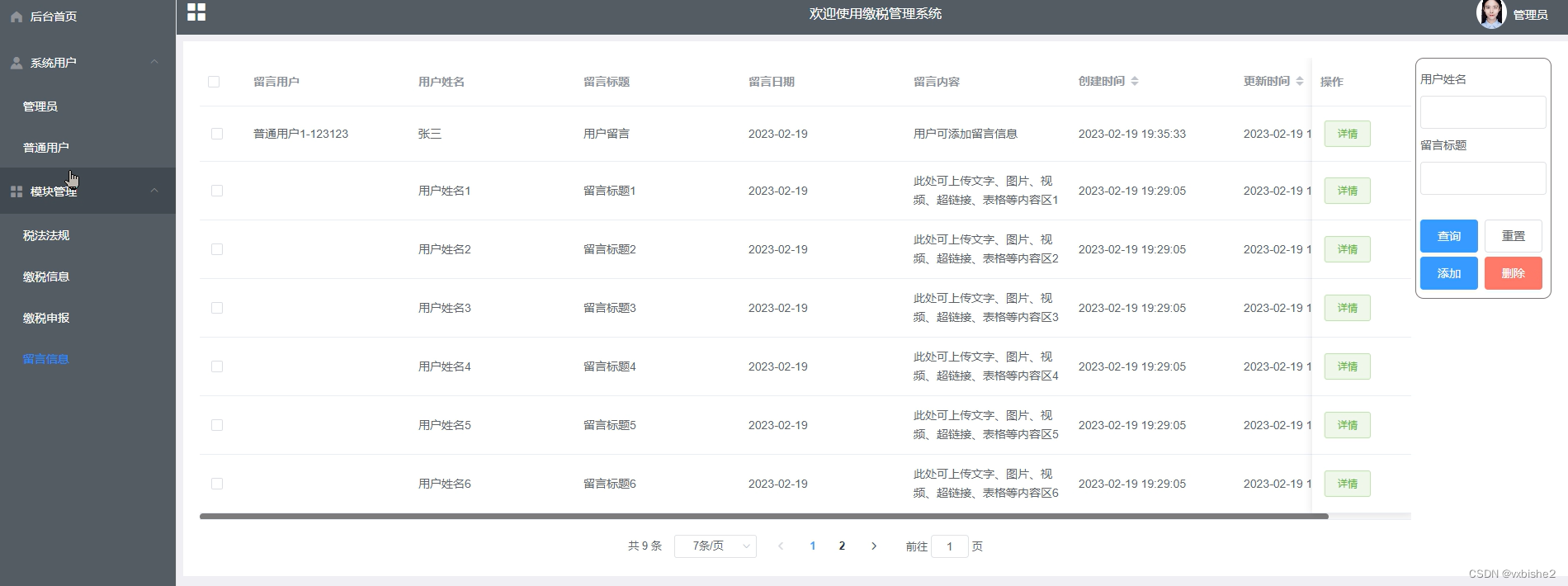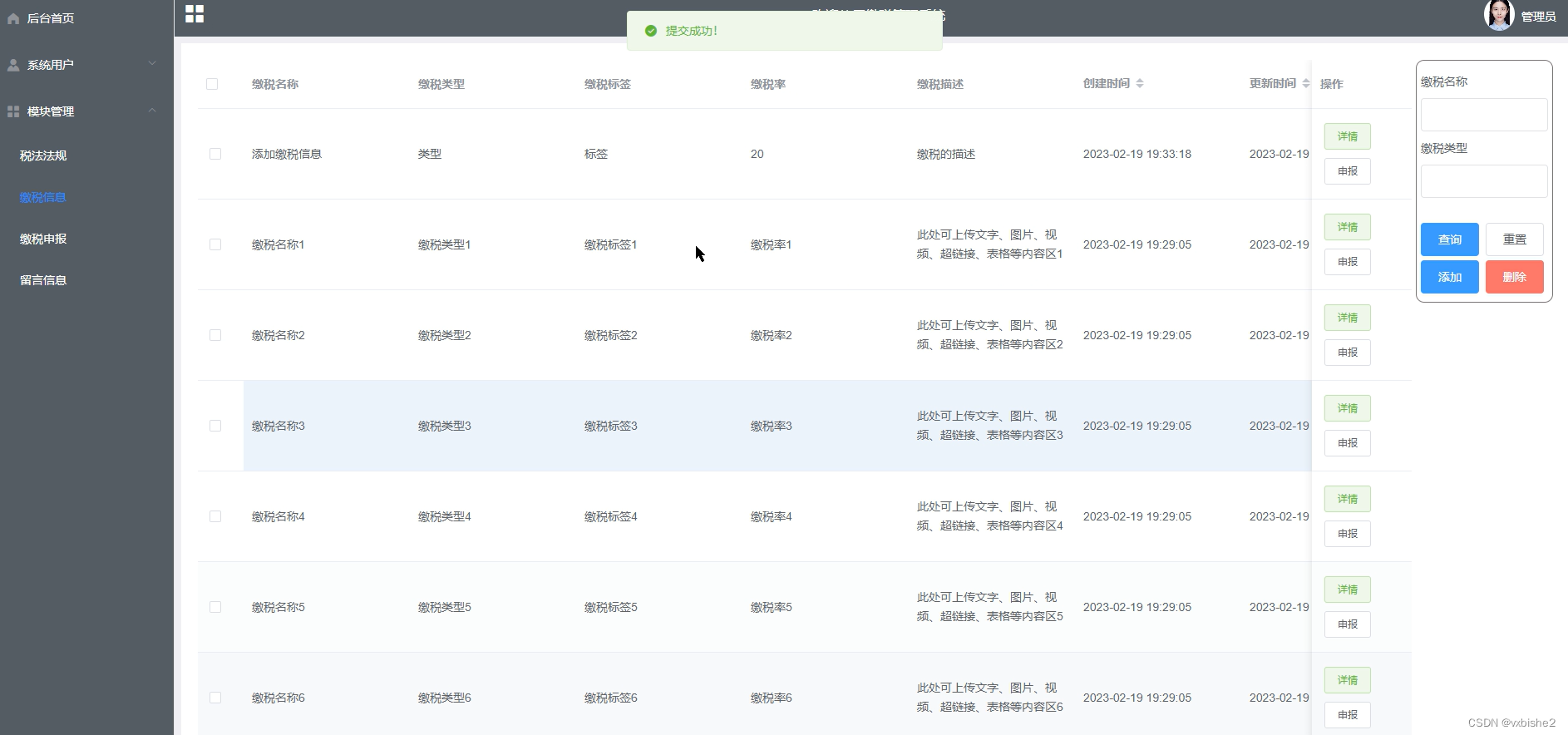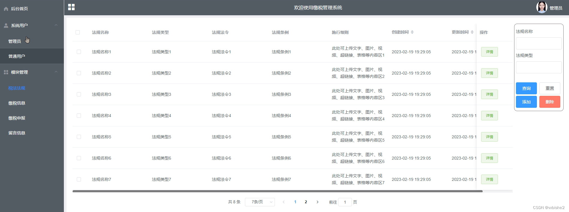 (1)功能要求:可以管理后台首页、个人信息、修改密码、系统用户(管理员、普通用户)、模块管理(税法法规、缴税信息、缴税申报、留言信息)等功能模块。