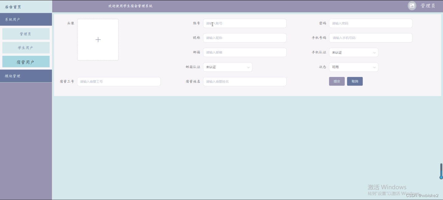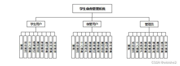 (1)功能要求:后台首页,系统用户(管理员、学生用户、宿管用户)模块管理(宿舍信息、维修登记、离校返校、宿舍费用、晚归信息、快件信息)个人信息等功能模块。