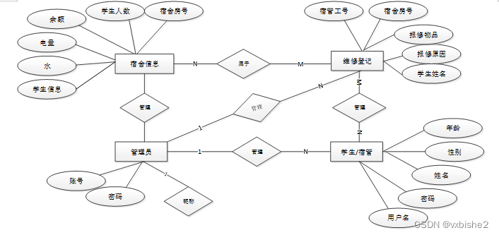 通过学生宿舍管理系统的功能进行规划分成几个实体信息,实体信息将通过ER图进行说明,本系统的主要实体图如下: