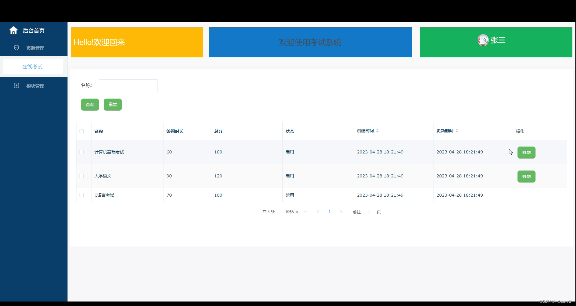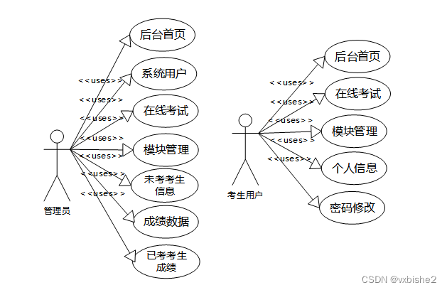 考试系统的主要使用者分为管理员和考生用户,实现功能包括后台首页,在线考试,系统用户(管理员,考生用户),模块管理(未考考生信息,成绩数据,已考考生成绩)等功能。