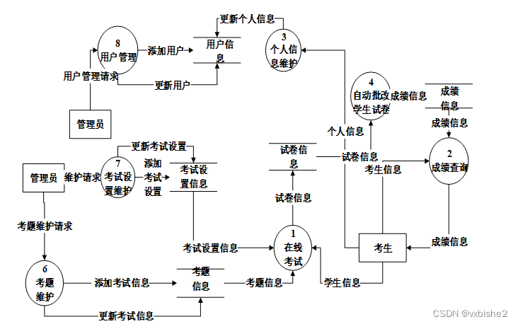 对系统的数据流进行分析,系统的使用者分为二类,考生用户,管理员。系统主要对界面信息传送,登录信息的验证,注册信息的接收,用户各种操作的响应做处理。