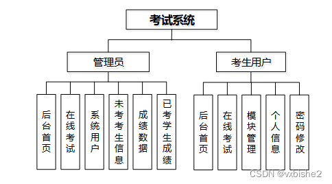 考试系统总体分为考生用户模块和管理员模块。