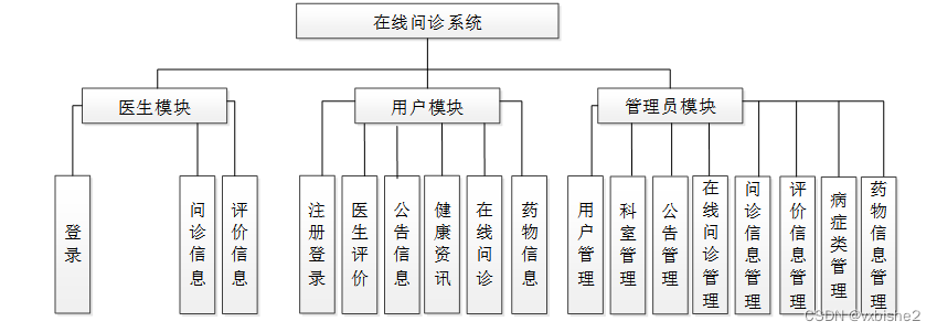 在线问诊系统总体分为前台用户模块和后台管理员模块。