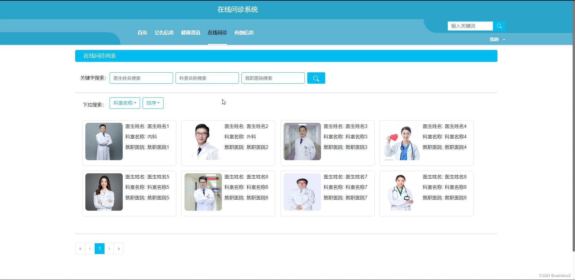 在线问诊:用户可以在在线问诊页面搜索医生或科室信息,浏览医生的详细信息,