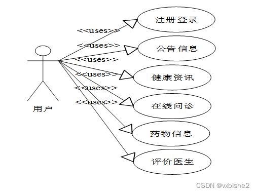 在线问诊系统的功能主要分为前台用户根据自己的需求进行注册登录,浏览医生信息并对选中的医生进行在线操作。后台系统管理员因职责的不同,分为医生和管理员,医生主要对问诊信息订单进行处理,而管理员主要对注册用户,健康资讯、科室管理、在线问诊、问诊信息、药物信息等进行管理。