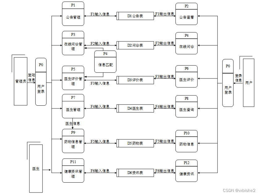 对系统的数据流进行分析,系统的使用者分为二类,一般用户(患者、医生),管理员。系统主要对界面信息传送,登录信息的验证,注册信息的接收,用户各种操作的响应做处理。