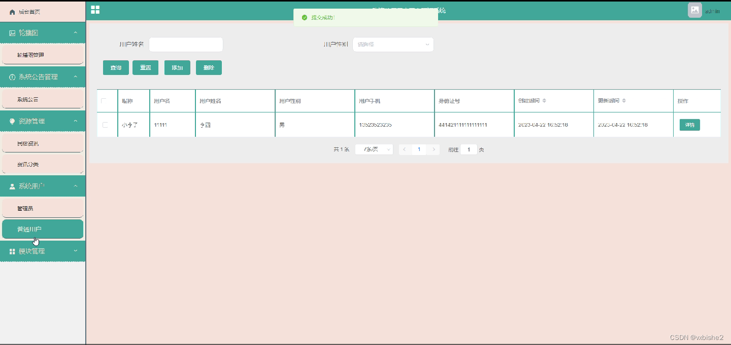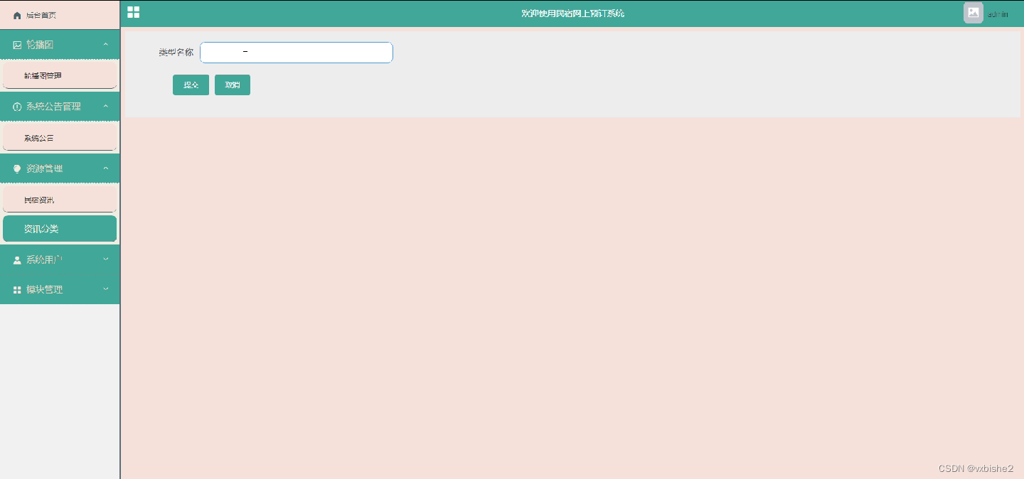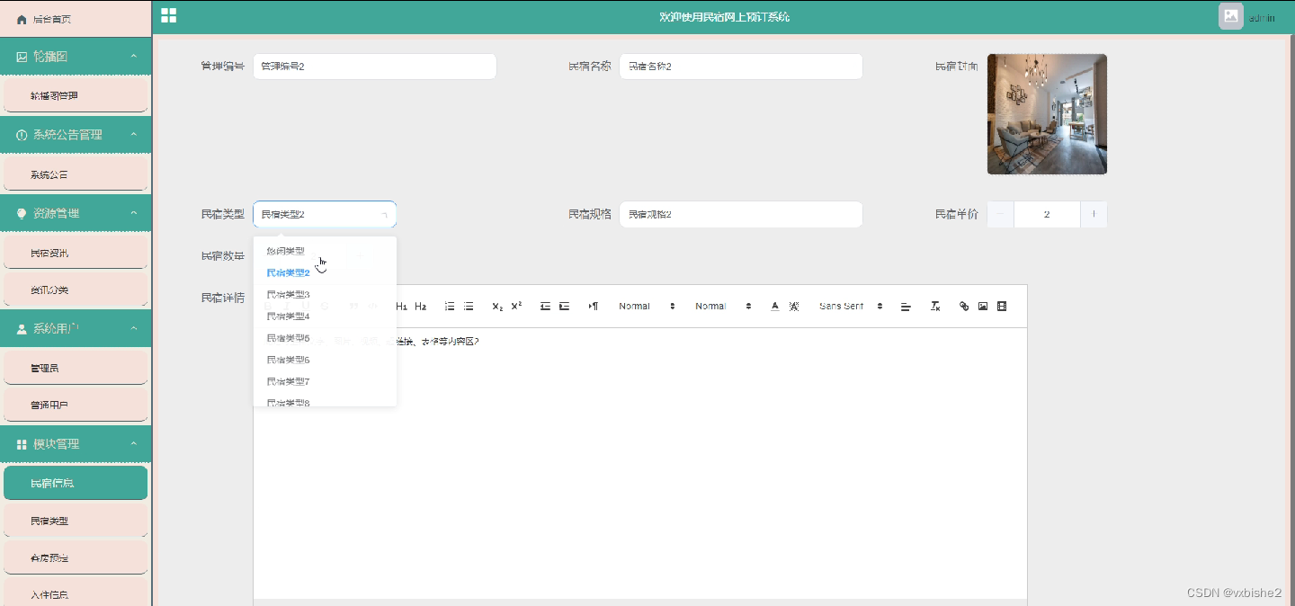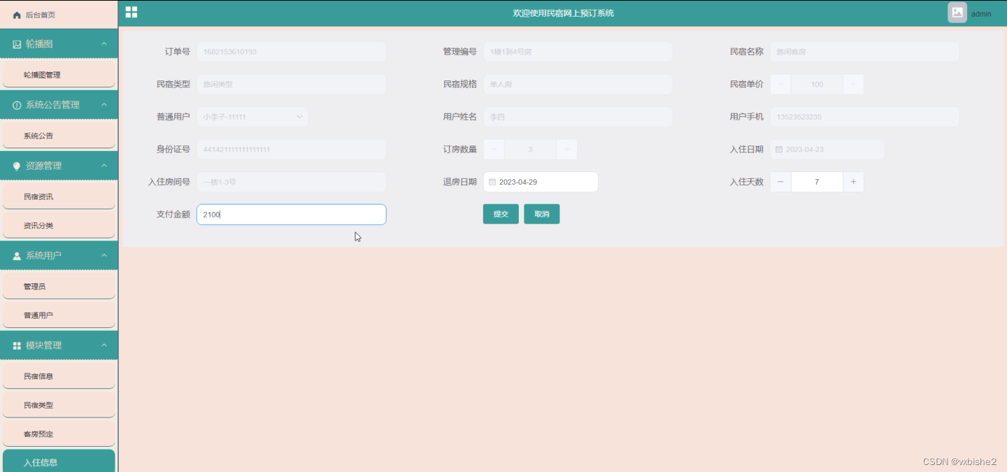 管理员登录进入民宿网上预订系统之后,就可以对所有的信息进行查看,可以查看到后台首页、轮播图、系统公告管理、系统用户管理(管理员、普通用户)、资源管理(民宿资讯、资讯分类)模块管理(民宿信息、民宿类型、客房预定、入住信息、退房信息)等功能。并且还可以对其进行相应的操作管理,如图5-2所示。