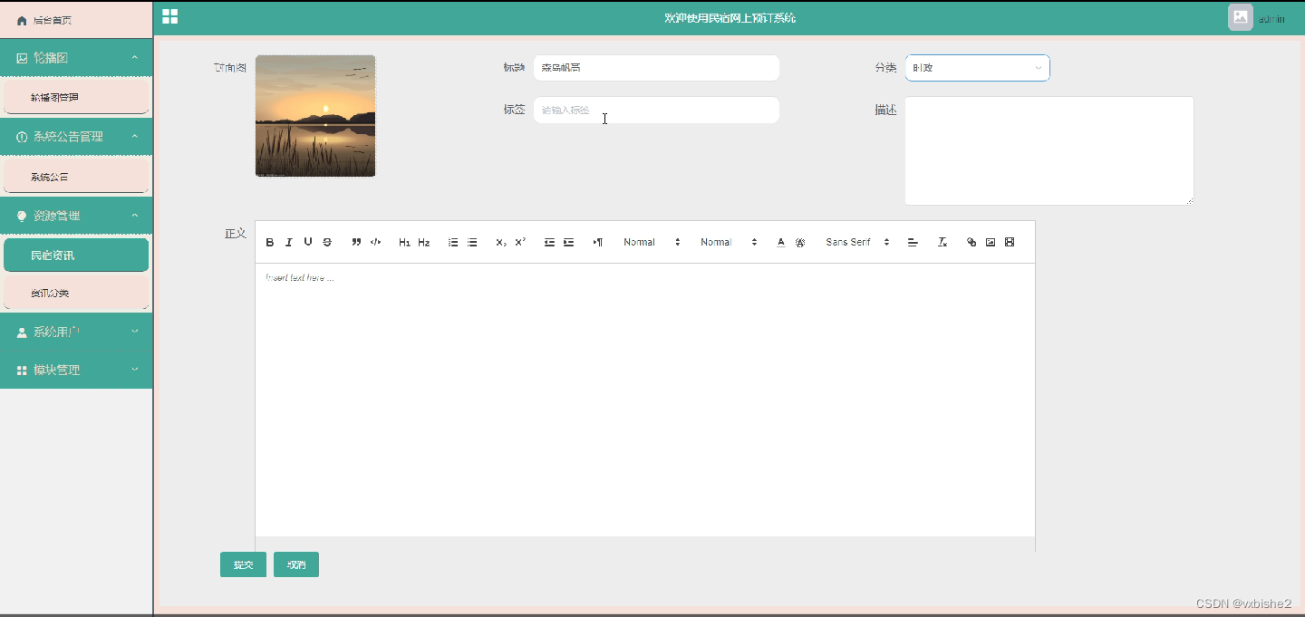 添加民宿资讯页面,在民宿资讯页面填写标题、封面图、分类、标签等信息完成民宿资讯录入,如图5-5所示