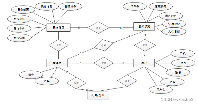 本民宿网上预订系统采用的是MYSQL数据库,数据存储快,因为民宿网上预订系统,主要的就是对信息的管理,信息内容比较多,这就需要好好的设计一个好的数据库,分类要清楚,不能添加信息的时候,造成信息太过混乱,设计好的数据库首先就需要先把各个实体之间的关系表达明确。