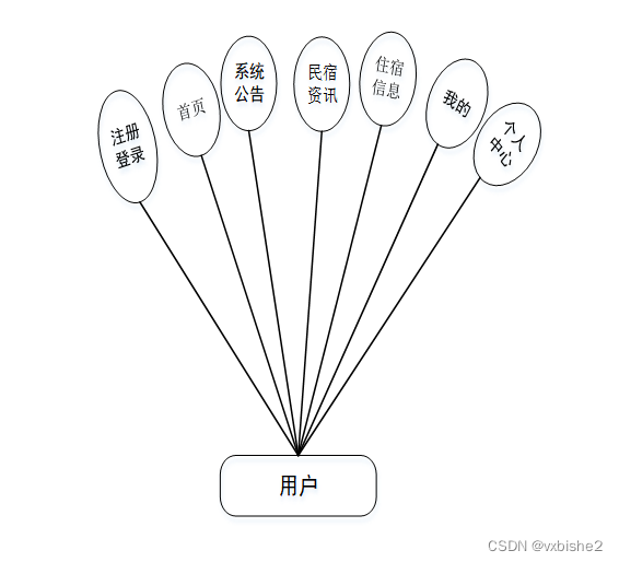 (2)用户:首页、系统公告、民宿资讯、民宿信息、我的(我的账户、我的收藏、个人中心)等功能。用户用例图如图3-2所示。