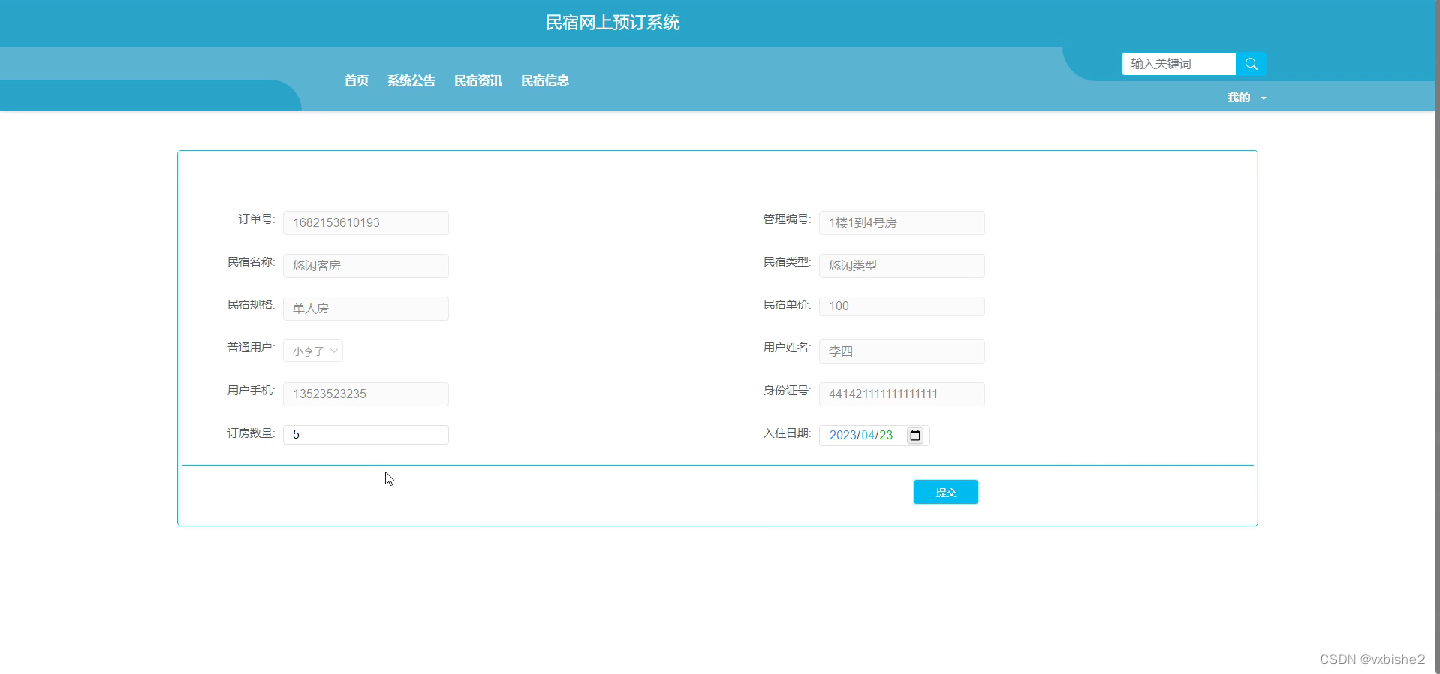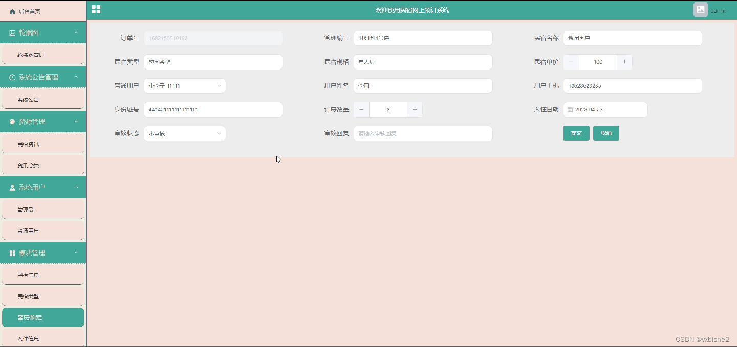 客房预定页面,用户登录系统,在预定页面输入订房数量和入住日期等详细信息进行预定提交,预定提交如图5-7所示,审核预定如图5-8所示。