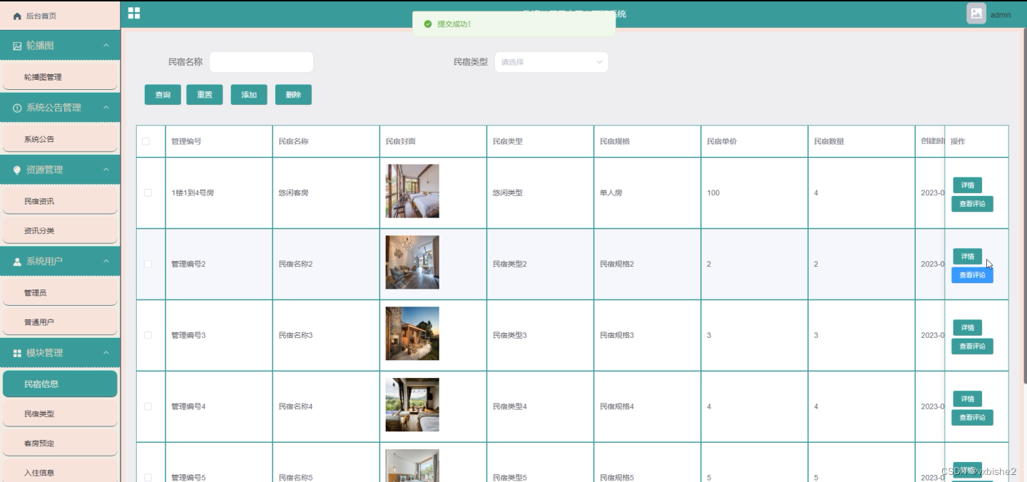 民宿信息,管理员在此页面可添加民宿信息,如:管理编号、民宿名称、封面、类型、规格、单价、数量、详情等详细信息,并可根据需要进行增删改查、查看前台用户的评论等操作;民宿信息如图5-6 5-7所示。