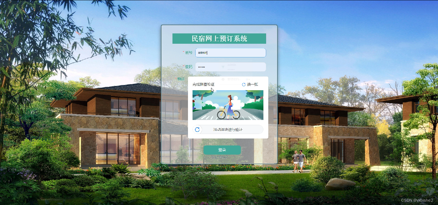 民宿网上预订系统,在系统登录页面管理员填写账号、密码等信息滑动滑块进行验证登录,如图5-1所示。
