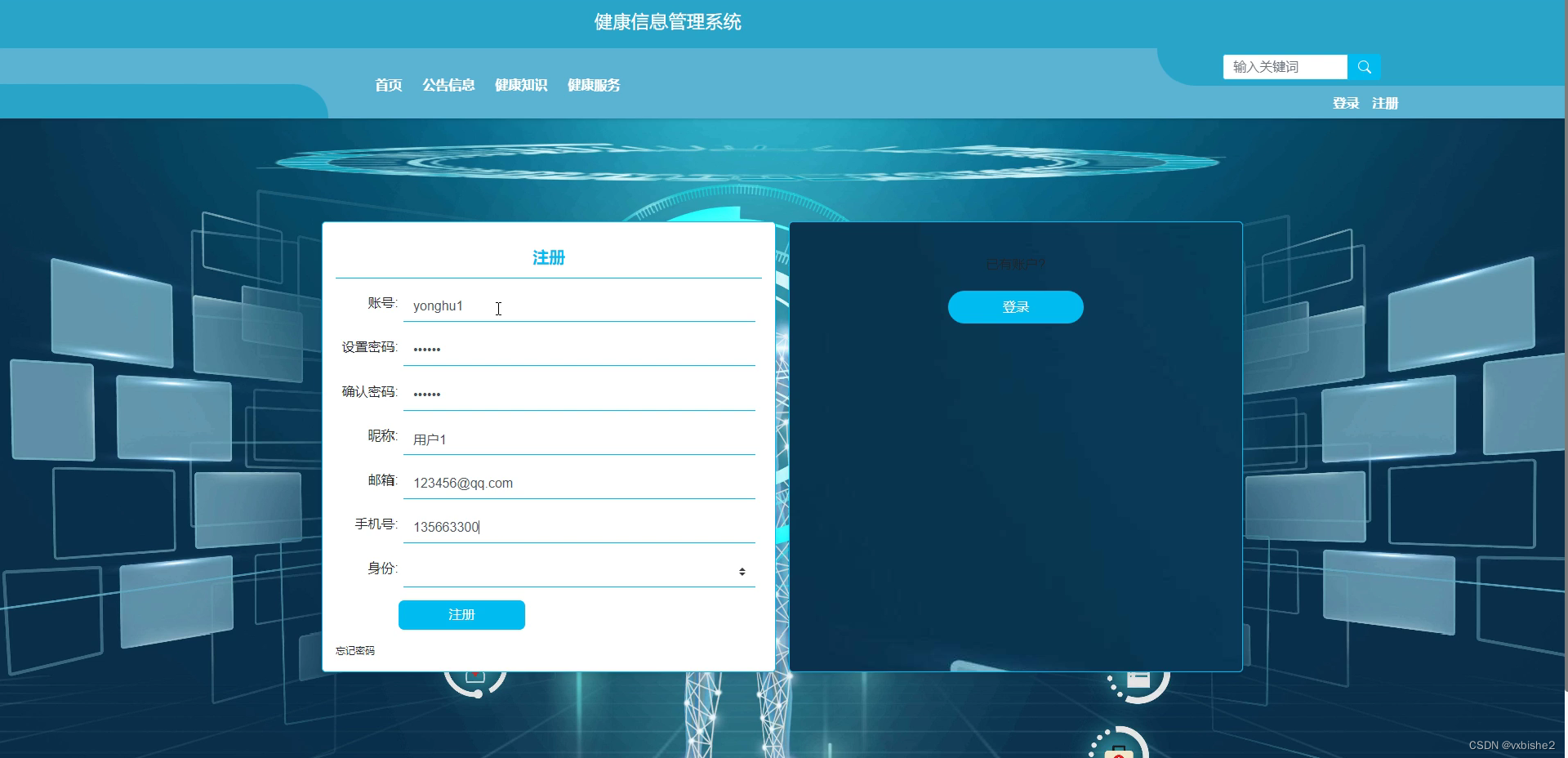 In today's era of rapid development of IT technology and wide application of the Internet, electronic and network technologies have brought convenience to people's lives, but also directly or indirectly damage people's health. Therefore, the significance of this graduation design creation is to provide convenience for users to enter and view health information through unified information management.