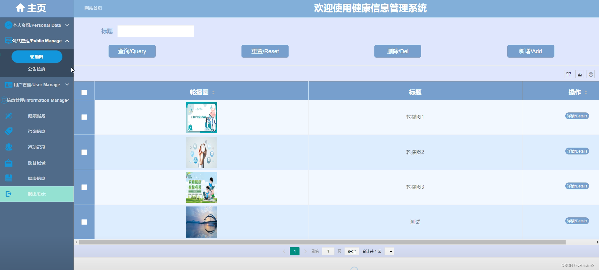 健康信息管理,管理员可以对用户的健康信息进行管理,如图4-9所示。