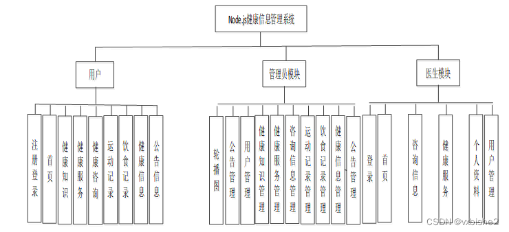 (3)确定好系统使用的技术,进行在线确认系统所划分的用户角色,并且根据用户角色划分确定所要设计的功能模块,对健康信息管理系统的设计主要划分用户角色,并所使用的功能模块也相应不同,但是系统的数据库实现的内容是交互的,用户可以随时根据自己的需求进行信息查看,对于系统工作人员可以根据自己的分管内容进行在线信息的处理及操作。