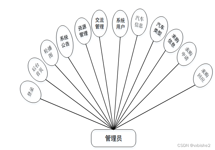 3.管理员主要负责后台首页、轮播图、系统公告管理、资源管理(汽车资讯、资讯分类)、交流管理(留言管理、留言分类)、系统用户(管理员、买家、卖家)、模块管理(汽车信息、汽车类型、求购申请、求购信息、求购回应)等功能模块,下图所示描述管理员的用例图。