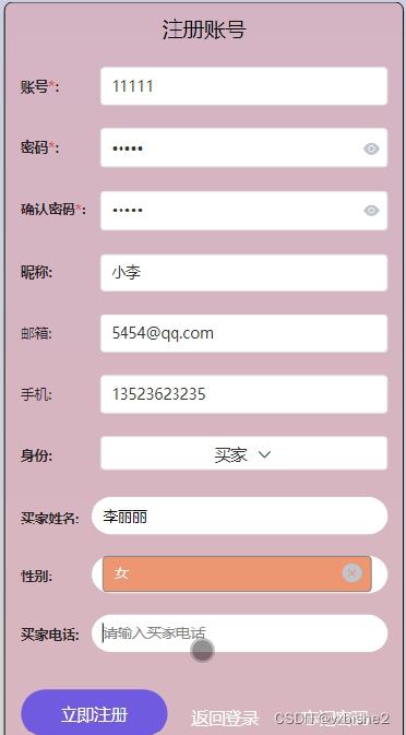 卖家用户注册在登陆页面填写账号、密码、邮箱、手机、昵称、身份、卖家姓名、卖家地址、卖家电话等信息,进行注册如图5.14所示