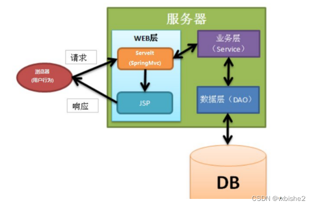 页面发送请求给控制器,控制器调用业务层处理逻辑,逻辑层向持久层发送请求,持久层与数据库交互,后将结果返回给业务层,业务层将处理逻辑发送给控制器,控制器再调用视图展现数据。