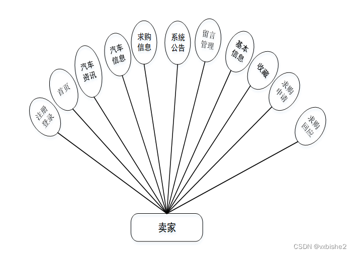 - 卖家用户主要使用系统的二手车交易系统操作首页、汽车信息、求购信息、汽车资讯、留言管理、系统公告、我的(基本信息、收藏、求购申请、求购回应)下图所示描述卖家的用例图。