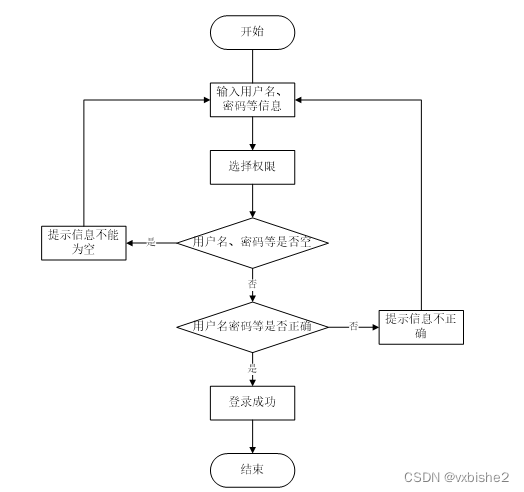 用户想进入系统,首先进入系统登录界面,通过正确的用户名、密码,选择登录类型登录,系统会检查登录信息,信息正确,然后输入相应的功能界面,提示信息错误,登录失败。系统操作流程如图3-4所示。