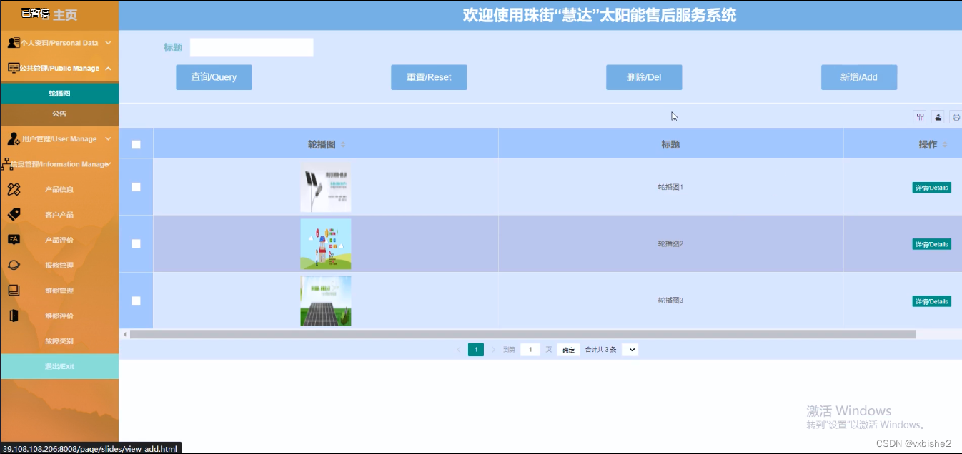 珠街“慧达”太阳能售后服务系统小程序中的管理人员在“公共管理”这一菜单中是可以对用户端显示的轮播图以及公告进行管控。界面如下图4.10所示: