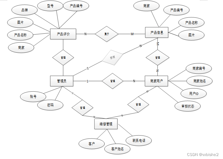 珠街“慧达”太阳能售后服务系统小程序根据上面的E-R实体图,就再找到实体与实体之间的关系来,制作总的E-R图,实体之间的关系一共有4种,也就是一对一,多对一,一对多和多对多,总的E-R图是设计数据库表格的依据,如下图是网站的总E-R图。