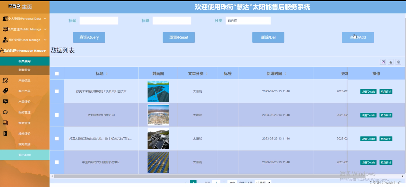 (2)珠街“慧达”太阳能售后服务系统小程序中的web管理端管理中的前端使用的是bootstrap框架,它配合ajax和jquery可以美化页面设计。